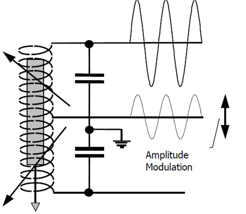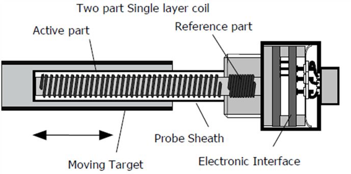 As the name implies, LVIT’s are based on a non-contact inductive technology. Inductive technology was chosen early in development for its combination of robustness and performance. Specifically, the sensor is based on the change in inductance of a coil that is exposed to different amounts of conductive surfaces. As shown in Figure 2 below, the inductor is a coil of wire wound on a non-conductive rod . The inductance is affected by the presence of a conductive surface called the target which slides over the outside of the coil . The target is connected to the device whose position is being measured.