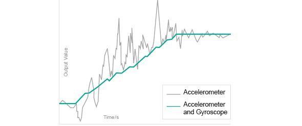 The accelerometer measures the tilt position, while the gyroscope determines the rate of rotation. Accelerations have a huge impact on the accelerometer, but a limited effect on the measured rotation rates of the gyroscope. An innovative algorithm combines both signals, to get the best value out of each sensor. This way the sensor is able to separate the actual position value from the errors introduced by external accelerations.