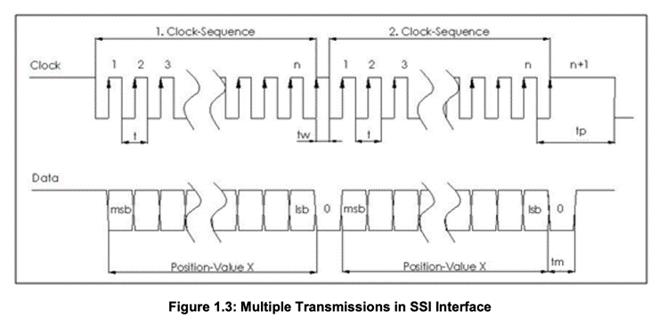Synchronous Serial Interface (SSI) is a widely used serial interface standard for industrial applications especially, rotary encoders. It is a point-to-point connection from a master (e.g. PLC, microcontroller or other control systems) to a slave (e.g. the rotary encoder). In this type of interface, the position data is continually updated by the sensor and made available to the output register. Data is shifted out when the sensor receives a pulse train from the controller. When the least significant bit (LSB) is transmitted, the sensor holds the data constant for a certain period of time. When this time has elapsed, the new position data is updated to the output register continuously once again.
