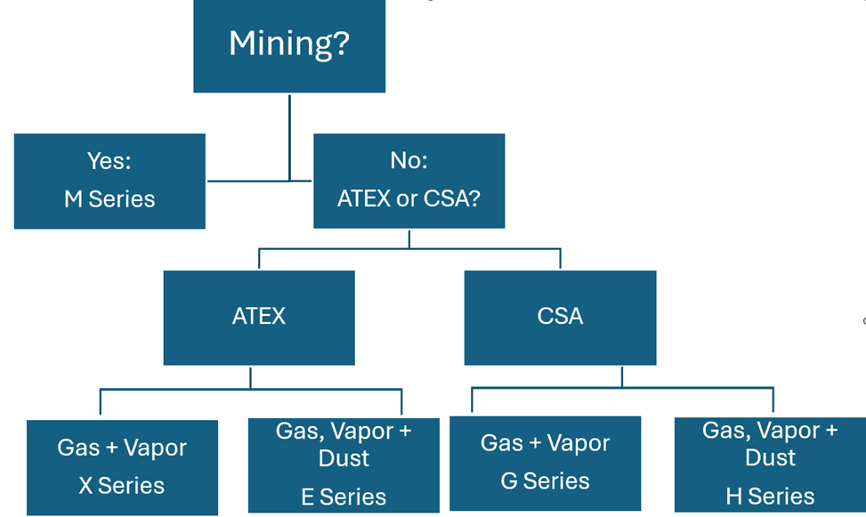 Based on the specific application, ATEX and CSA US rated sensors are available for gas and dust as well as vapor and mining. See below table for details.