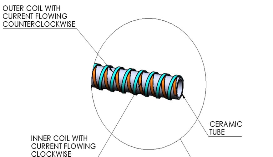 These advantages are possible due to the fundamental design of the sensor. The LVR sensor consists of a coil wound on a round ceramic tube as shown above. The initial layer of wire is wound as a helix with a large pitch. Upon reaching the end of the tube, the pitch is reversed, and a returning reverse helix is laid over the first coil. The two ends of the double coil are attached via separate cables to remote electronics, forming a resonant circuit that oscillates in the 2 – 4 MHz region. The two coils are now wired in series with current flowing clockwise in one coil and counterclockwise in the other. The magnetic field of each coil, as determined by the right-hand-rule, are parallel to the sensor but point in opposite directions and thus cancel each other. At the same time, also by the right-hand-rule”, the electric fields are perpendicular to the sensor and thus are additive. The resulting electromagnetic field outside the coil is a strong electric field with minimal magnetic component. Thus a metal rod attached to the item to be measured will change the frequency in a rapid and predictable manner.