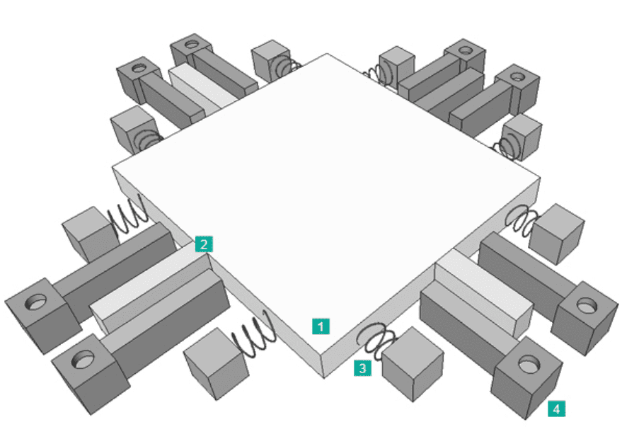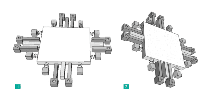 The function can be illustrated with a simplified model with two electrodes: one fixed, and the other (the proof mass) is movable, suspended by spring elements (see Fig. 1). When the inclinometer is in a horizontal position (Fig. 2.1), the capacitance between the electrodes is measured. If the sensor is tilted (Fig. 2.2), the movable mass and its electrode will change position relative to the fixed electrode. This resulting change of capacitance between the two electrodes is measured by the sensor cell and used to calculate the new inclination value.