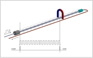 The working principle of magnetostrictive sensors involves an electronic circuit sending an initial pulse to the magnetostrictive measurement wire. This electric pulse creates an electromagnetic wave traveling along the magnetostrictive wire. A magnet, which moves based on the changing mechanical position outside the sensor, generates a stop signal at the point where it meets the electromagnetic wave. The ratio between the initial pulse signal and the stop signal contains the position information of the sensor.